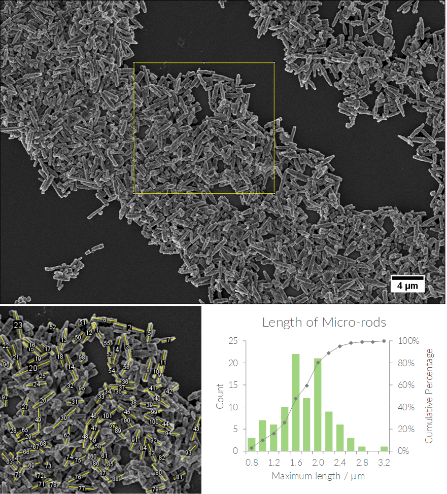 In the example below, I measured the length of the rod-like particles manually as they were overlapping heavily. The square indicates the area that I analyzed and the yellow lines and numbers mark the measured particles. Then I exported the data to Excel and calculated the length distribution, but the ImageJ software can generate a histogram from your measurements as well.